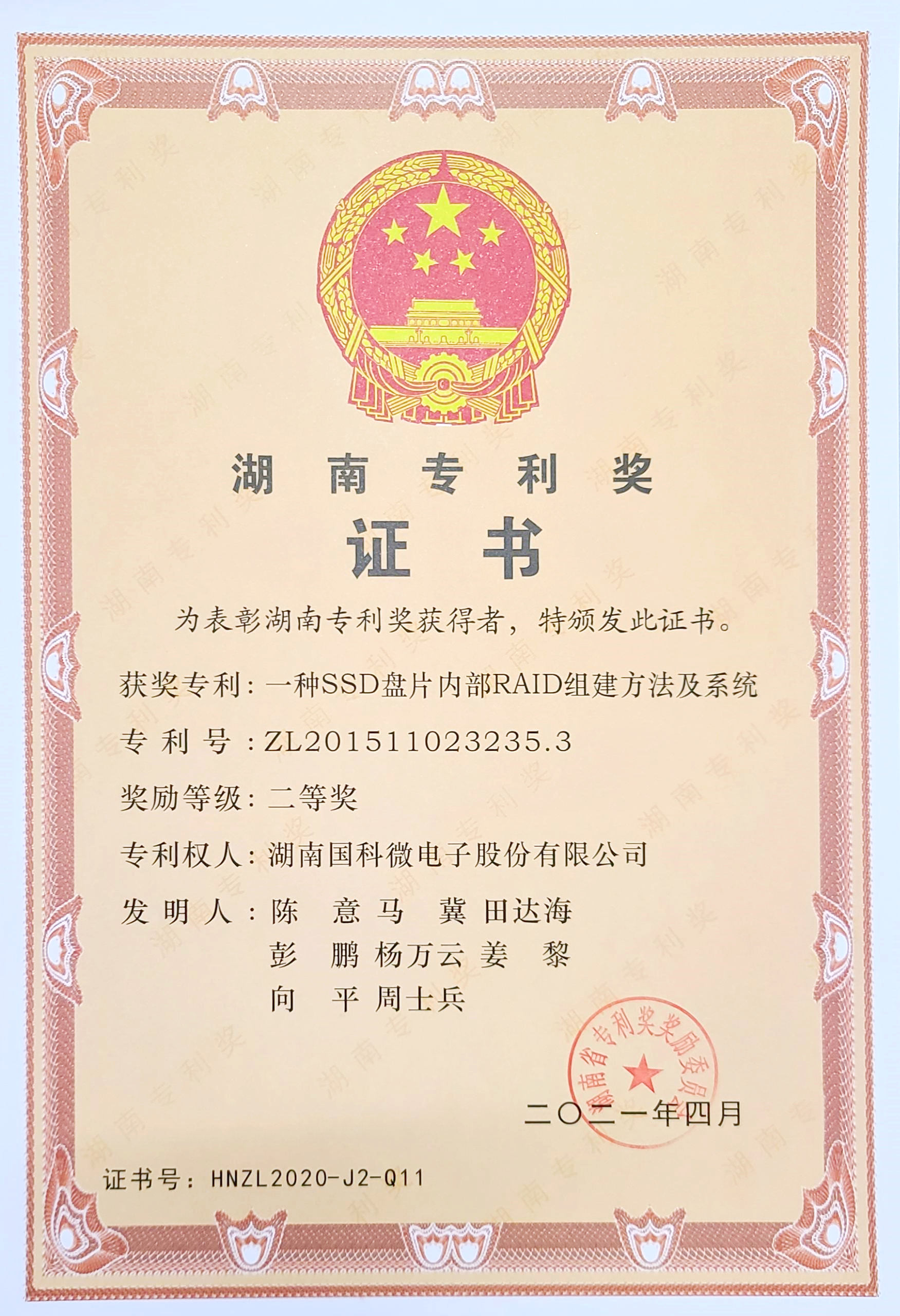 湖南專利獎(jiǎng)證書